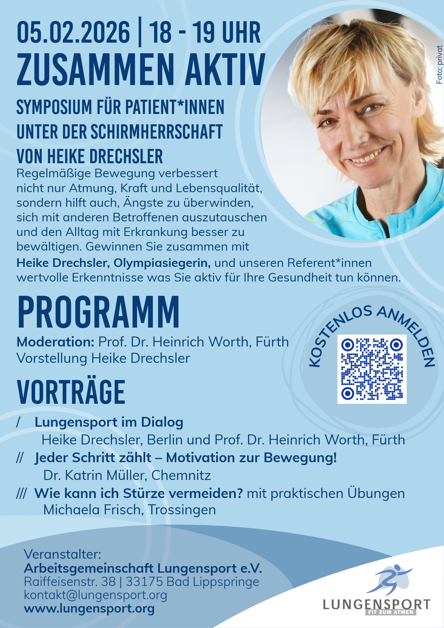 Heike Drechsler und Professor Worth laden Sie herzlich ein! Regelmäßige Bewegung verbessert nicht nur Atmung, Kraft und Lebensqualität, sondern hilft auch, Ängste zu überwinden, sich mit anderen Betroffenen auszutauschen und den Alltag mit Erkrankung besser zu bewältigen. Gewinnen Sie zusammen mit Heike Drechsler, Olympiasiegerin, und unseren Referent*innen wertvolle Erkenntnisse was Sie aktiv für Ihre Gesundheit tun können. Die Veranstaltung beginnt am Donnerstag, 05.02.2026 ab 18 Uhr Anmeldung: https://register.gotowebinar.com/#register/1875135070332440670 ![]() |
